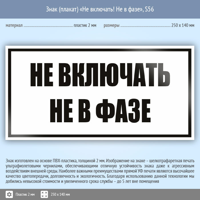 Знак (плакат) «Не включать! Не в фазе», S56 (пластик, 250х140 мм) в Череповце купить