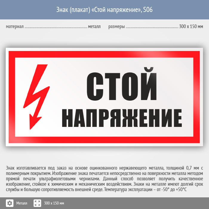Знак (плакат) «Стой напряжение», S06 (металл, 300х150 мм) в Череповце купить