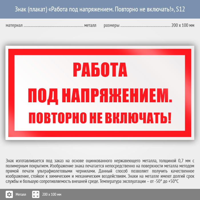 Знак (плакат) «Работа под напряжением. Повторно не включать!», S12 (металл, 200х100 мм) в Череповце купить
