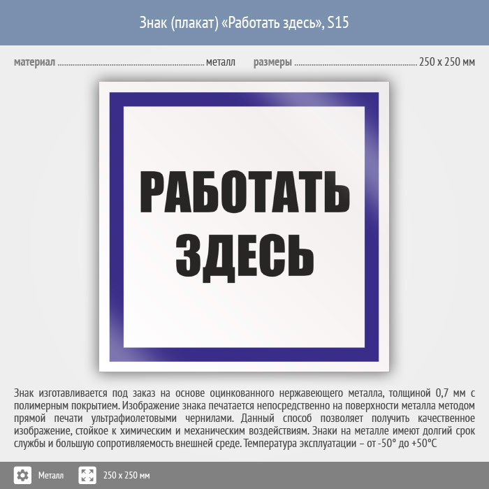 Знак (плакат) «Работать здесь», S15 (металл, 250х250 мм) в Череповце купить