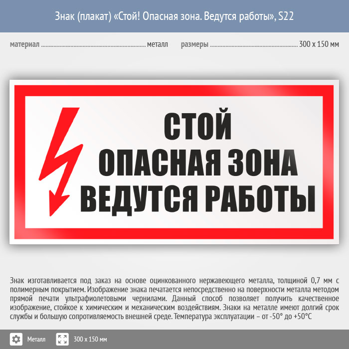 Знак (плакат) «Стой! Опасная зона. Ведутся работы», S22 (металл, 300х150 мм) в Череповце купить