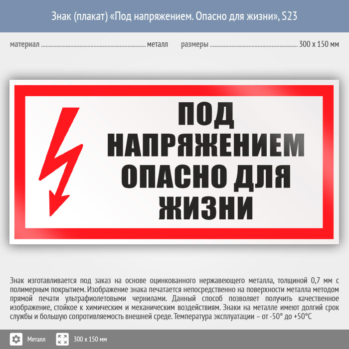 Знак (плакат) «Под напряжением. Опасно для жизни», S23 (металл, 300х150 мм) в Череповце купить