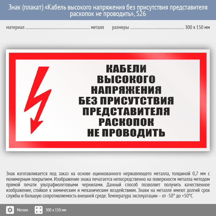 Знак (плакат) «Кабель высокого напряжения без присутствия представителя раскопок не проводить», S26 (металл, 300х150 мм) в Череповце купить