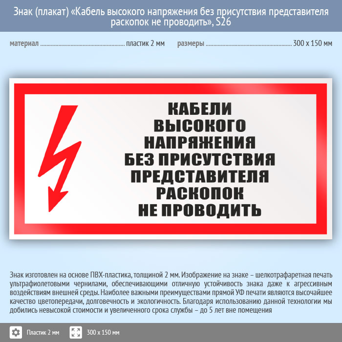 Знак (плакат) «Кабель высокого напряжения без присутствия представителя раскопок не проводить», S26 (пластик, 300х150 мм) в Череповце купить