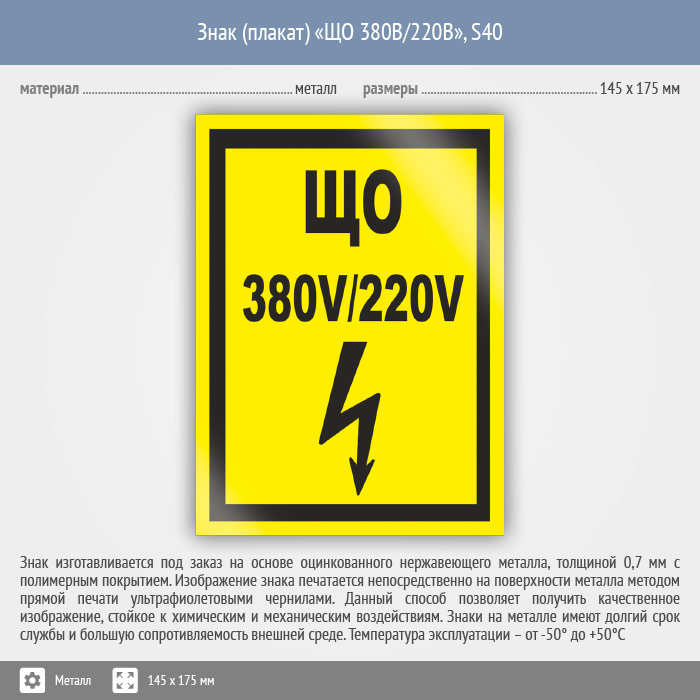 Знак (плакат) «ЩО 380В/220В», S40 (металл, 145х175 мм) в Череповце купить
