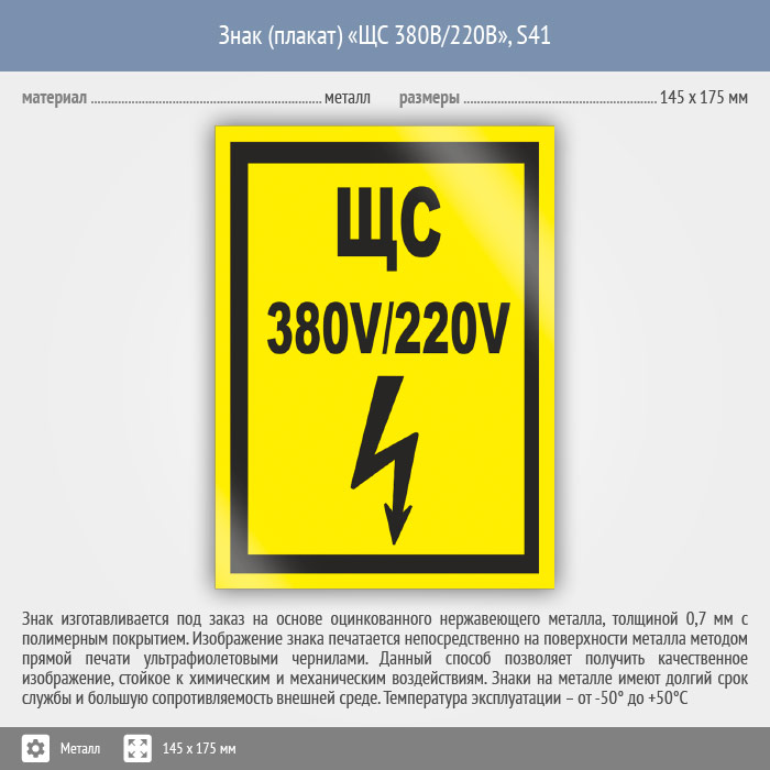Знак (плакат) «ЩС 380В/220В», S41 (металл, 145х175 мм) в Череповце купить