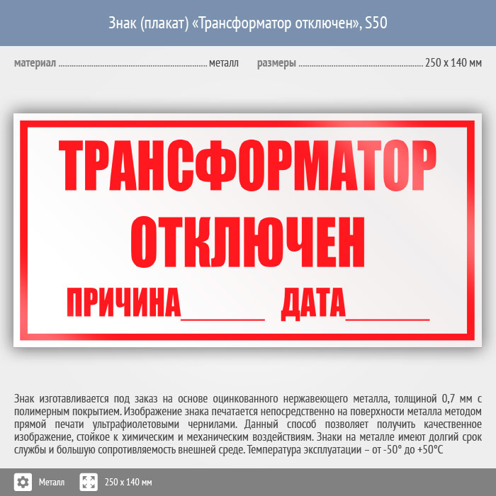 Знак (плакат) «Трансформатор отключен», S50 (металл, 250х140 мм) в Череповце купить