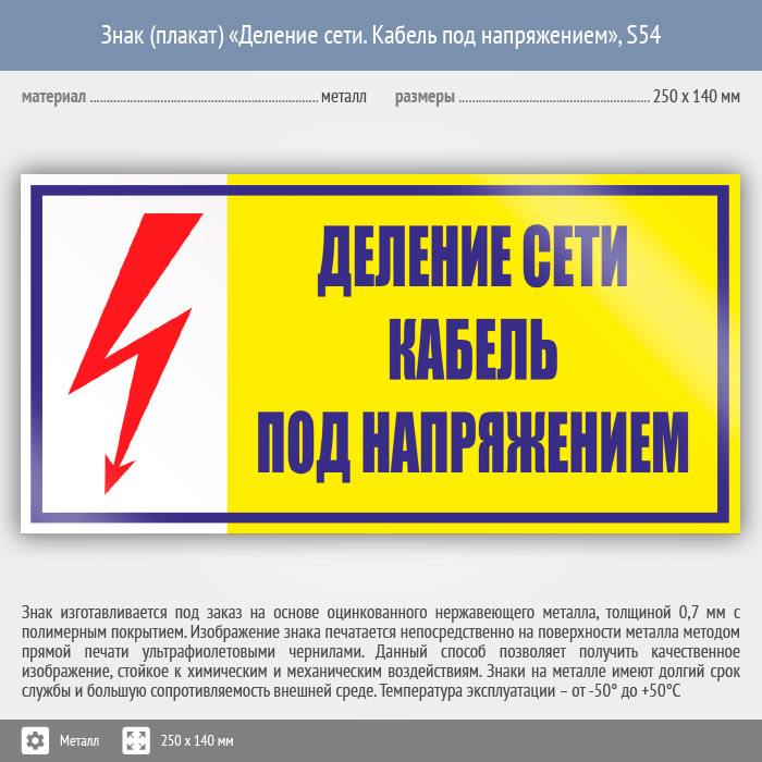 Знак (плакат) «Деление сети. Кабель под напряжением», S54 (металл, 250х140 мм) в Череповце купить