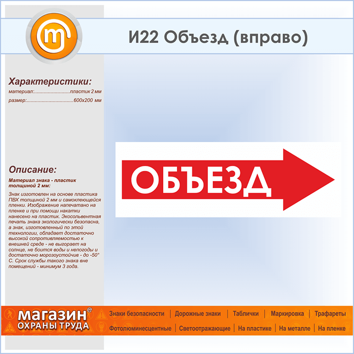 Знак «Объезд (вправо)», И22 (пластик, 600х200 мм) в Череповце купить