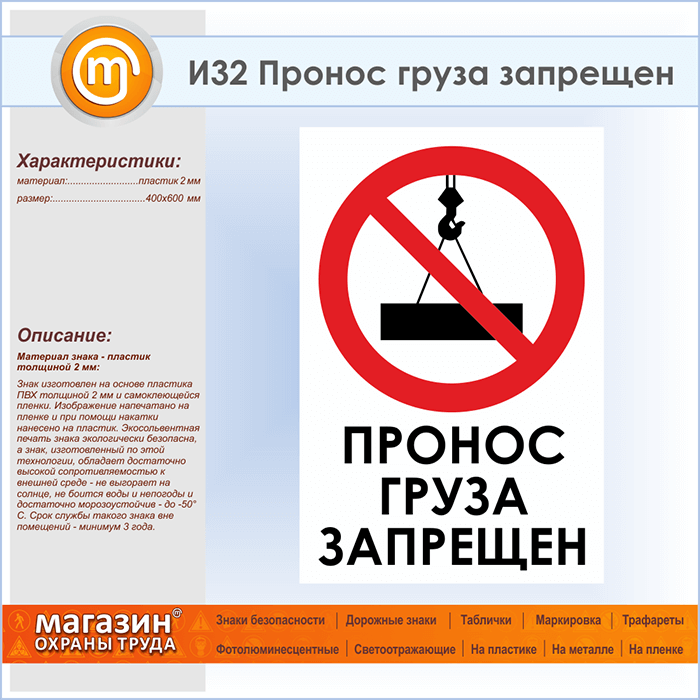 Знак «Пронос груза запрещен», И32 (пластик, 400х600 мм) в Череповце купить