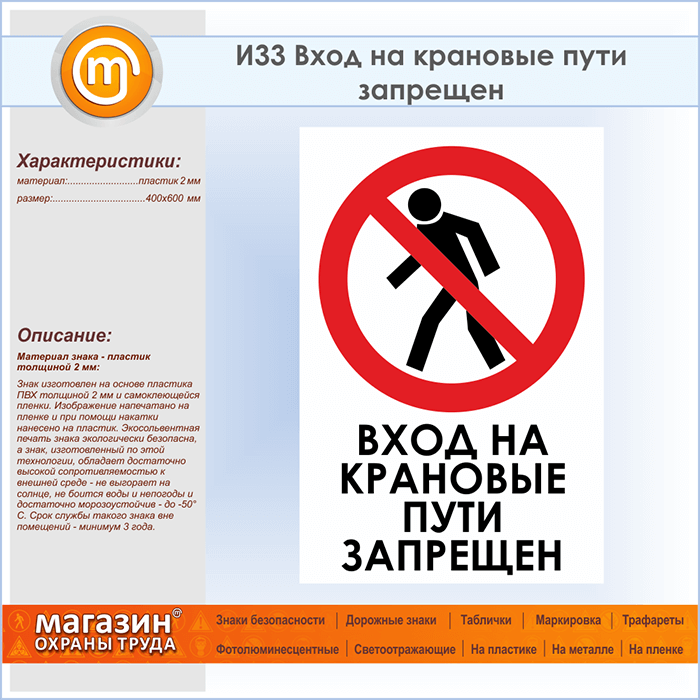 Знак «Вход на крановые пути запрещен», И33 (пластик, 400х600 мм) в Череповце купить