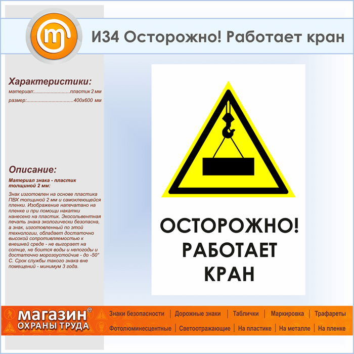 Знак «Осторожно! Работает кран», И34 (пластик, 400х600 мм) в Череповце купить