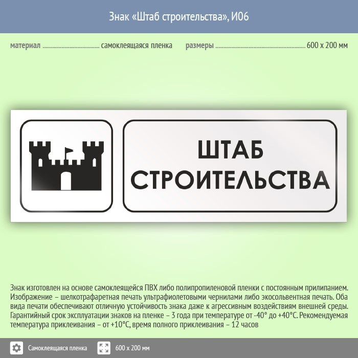 Знак «Штаб строительства», И06 (пленка, 600х200 мм) в Череповце купить