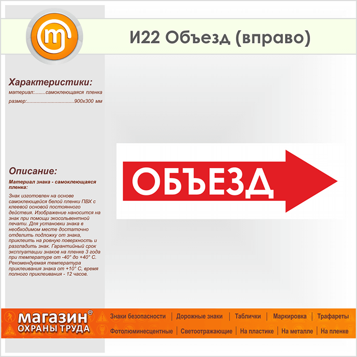 Знак «Объезд (вправо)», И22 (пленка, 900х300 мм) в Череповце купить