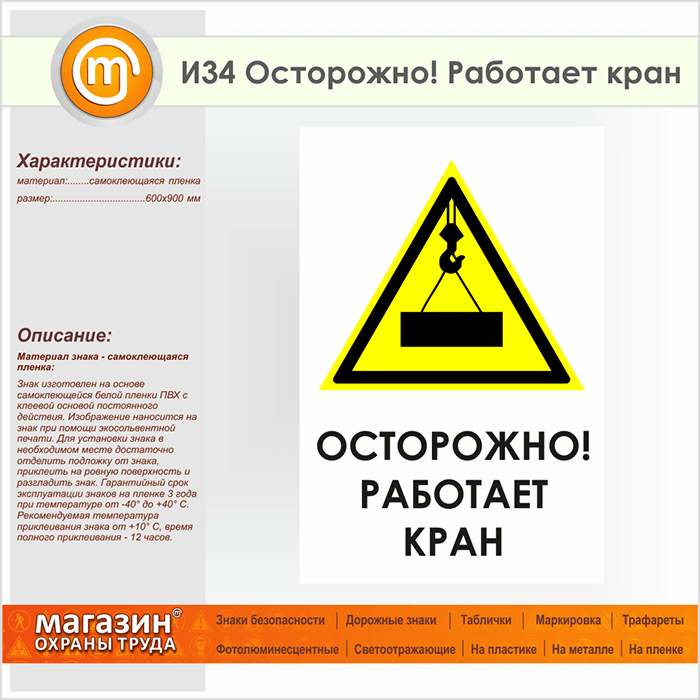 Знак «Осторожно! Работает кран», И34 (пленка, 600х900 мм) в Череповце купить