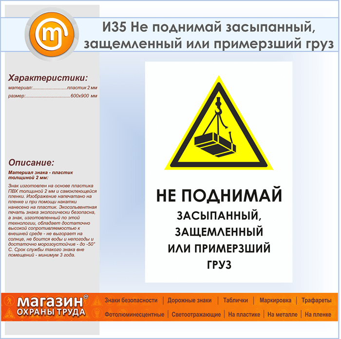 Знак «Не поднимай засыпанный, защемленный или примерзший груз», И35 (пластик, 600х900 мм) в Череповце купить