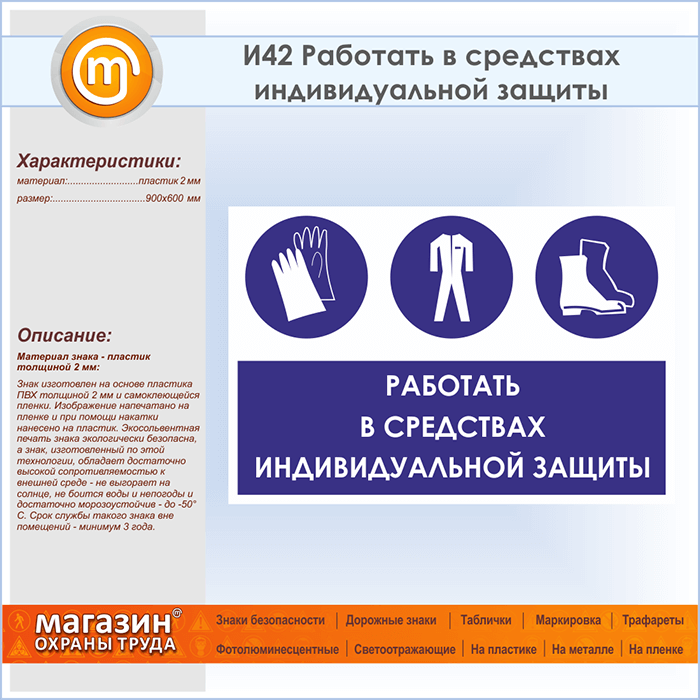 Знак «Работать в средствах индивидуальной защиты», И42 (пластик, 900х600 мм) в Череповце купить