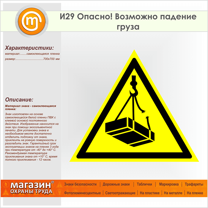Знак «Опасно! Возможно падение груза», И29 (пленка, сторона 700 мм) в Череповце купить
