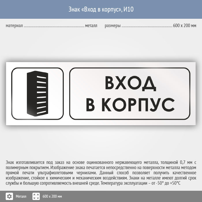 Знак «Вход в корпус», И10 (металл, 600х200 мм) в Череповце купить