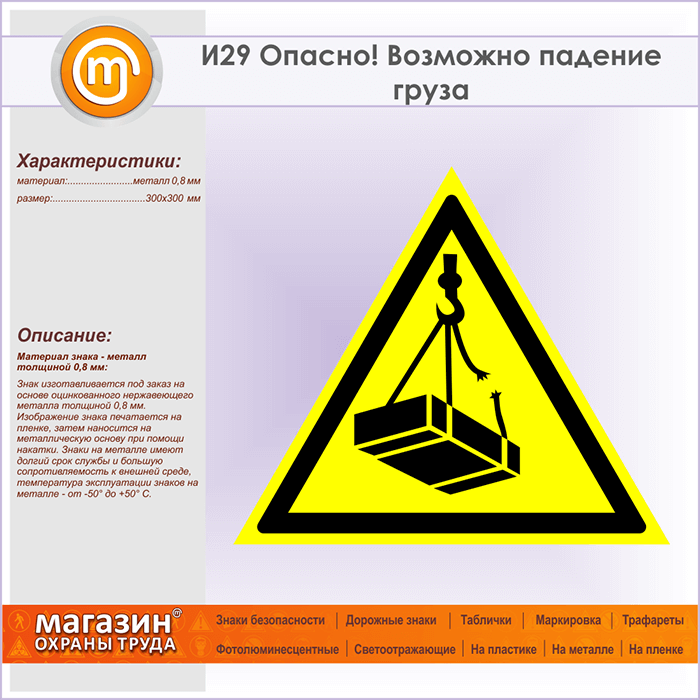Знак «Опасно! Возможно падение груза», И29 (металл, сторона 300 мм) в Череповце купить