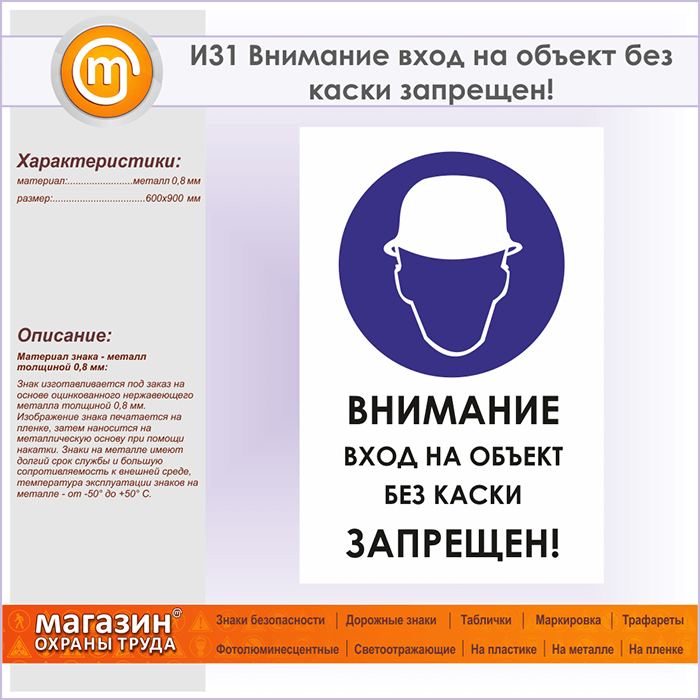 Знак «Внимание вход на объект без каски запрещен!», И31 (металл, 600х900 мм) в Череповце купить