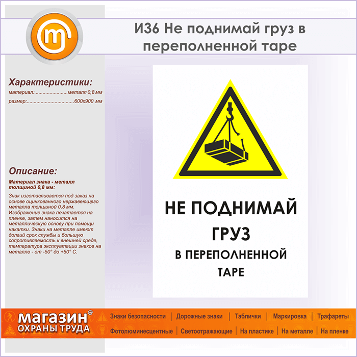Знак «Не поднимай груз в переполненной таре», И36 (металл, 600х900 мм) в Череповце купить