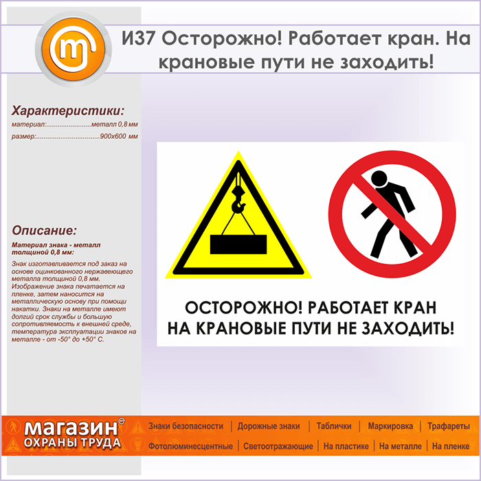 Знак «Осторожно! Работает кран. На крановые пути не заходить!», И37 (металл, 900х600 мм) в Череповце купить