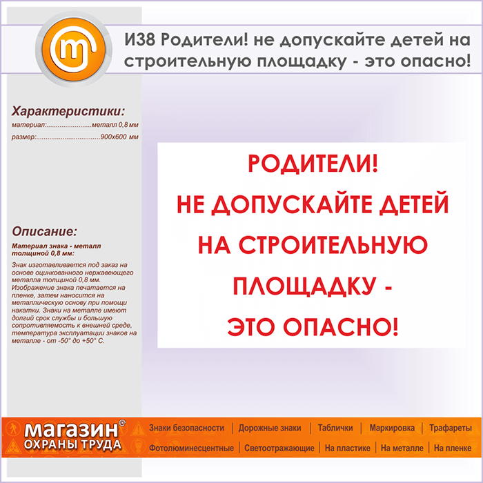 Знак «Родители! не допускайте детей на строительную площадку - это опасно!», И38 (металл, 900х600 мм) в Череповце купить